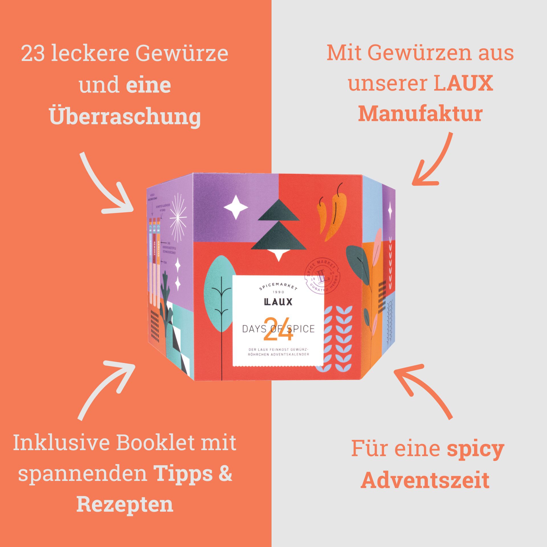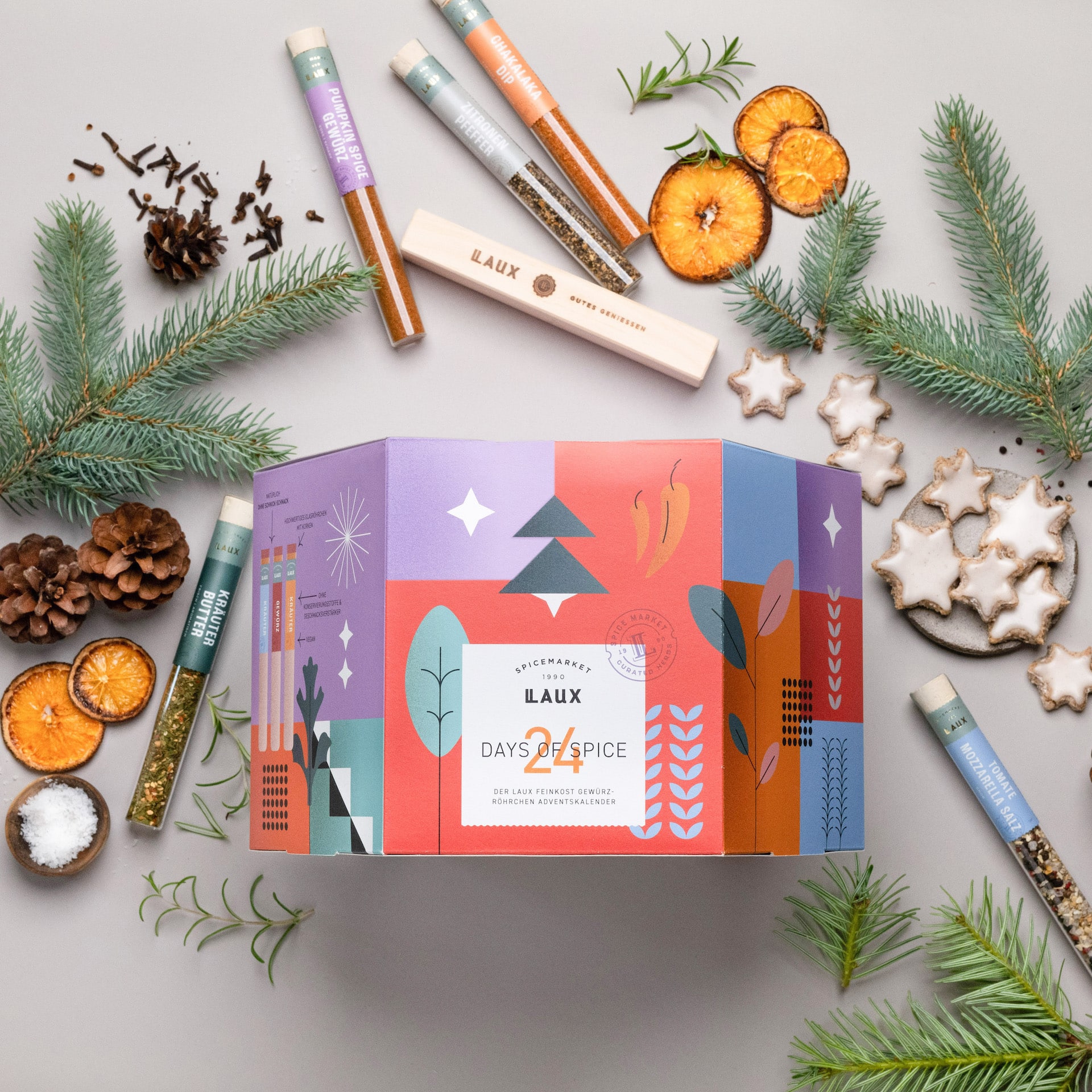 Adventskalender sind doch die schönste Idee, um die Wartezeit aufs Weihnachtsfest mit kleinen, feinen Überraschungen zu verkürzen. Der LAUX Gewürz-Röhrchen Adventskalender ist dabei ein besonders attraktives und geschmackvolles Exemplar. Denn er punktet als echter Hingucker während der Adventszeit in Wohnzimmer oder Küche und ermöglicht mit seinem hochwertigen würzigen Inhalt das allerschönste Geschenk für Genießer: Gemeinsam Zeit beim Kochen und Schlemmen zu verbringen und das Leben ein wenig spicy zu gestalten.