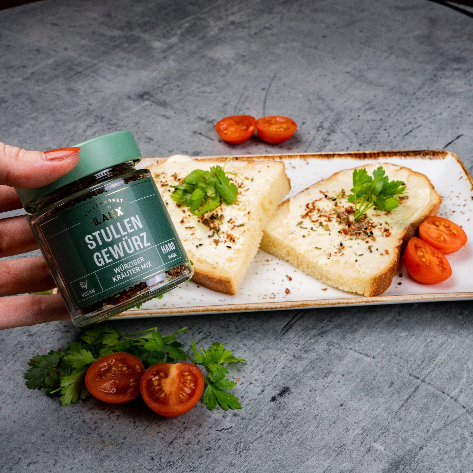 Ob Pausenbrot, Sandwich im Büro oder belegte Schnitte am Abend – mit dem LAUX Stullen Gewürz wird ein Geschmackserlebnis daraus! Die bunte Mischung aus Gartenkräutern, Lauch und Zwiebeln sowie Tomatenflocken schmeckt nach Sommer und peppt jeden Belag oder Aufstrich ganz einfach und schnell auf. Direkt aufs belegte Brot streuen und das volle Aroma genießen! Probiere den Stullen-Mix auf Frischkäse, pflanzlichem Brotaufstrich oder einfach auf purer (veganer) Butter aus. Aber auch frische Tomate, Gurke oder Avocado auf Landbrot oder Vollkornbrot bekommen mit dem kräuter-würzigen Mix einen extra Geschmackskick.